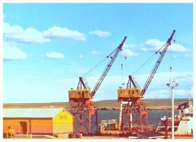 Estos antiguos guinches o grúas de muelle, vienen prestando servicios desde hace por lo menos más de 40 años en el puerto local. Son grúas que quedan unidas al suelo (o a alguna estructura anexa). La viga horizontal de celosía se le llama pluma y el pilar vertical se llama torre. Al final de la torre está la corona donde gira la pluma. La pluma tiene unos contrapesos en un extremo para generar el balance y también va cargada en el cimiento para conseguir el momento de empotramiento necesario para funcionar, que a su vez es rígidamente sostenida mediante dos o más patas. Estas patas generalmente pueden desplazarse sobre unos rieles horizontales al nivel del suelo. Para el correcto funcionamiento de la grúa deben existir controladores de pares de fuerza y de distancia para no someter a la grúa a mayores tensiones de la necesaria. Para el guiado de la grúa se pueden usar señalistas o comunicación por radio. El control se puede realizar desde suelo o desde una cabina situada en la punta de la torre.